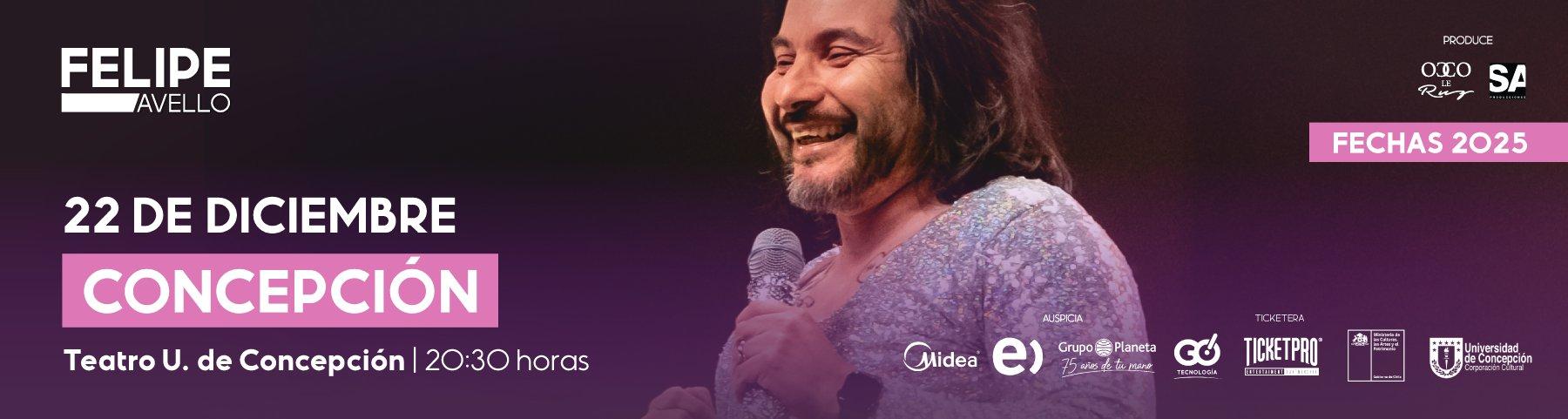 Felipe Avello regresa a Concepción para presentar su show de humor en el Teatro U. de Concepción, agendando shows para diciembre de 2025 y marzo de 2026.