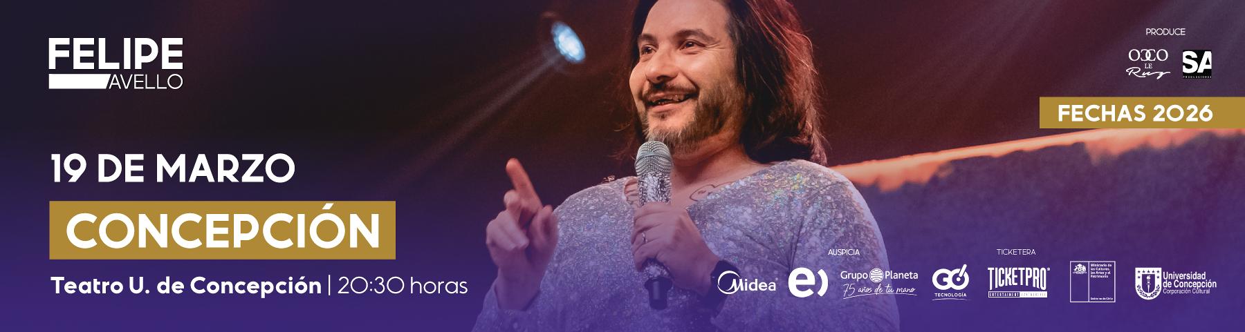 Felipe Avello regresa a Concepción para presentar su show de humor en el Teatro U. de Concepción, agendando shows para diciembre de 2025 y marzo de 2026.